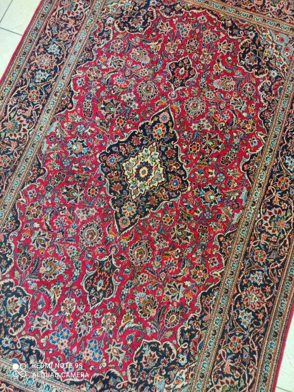 Tapis traditionnel avec médaillon central à fleurs, écoinçons rappelant le médaillon central, bordures fleuries ou tapis de chasse avec cavaliers et animaux.